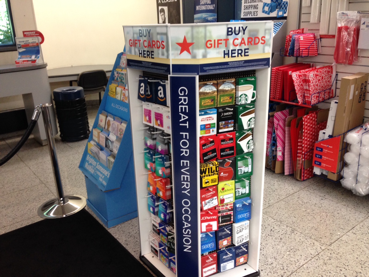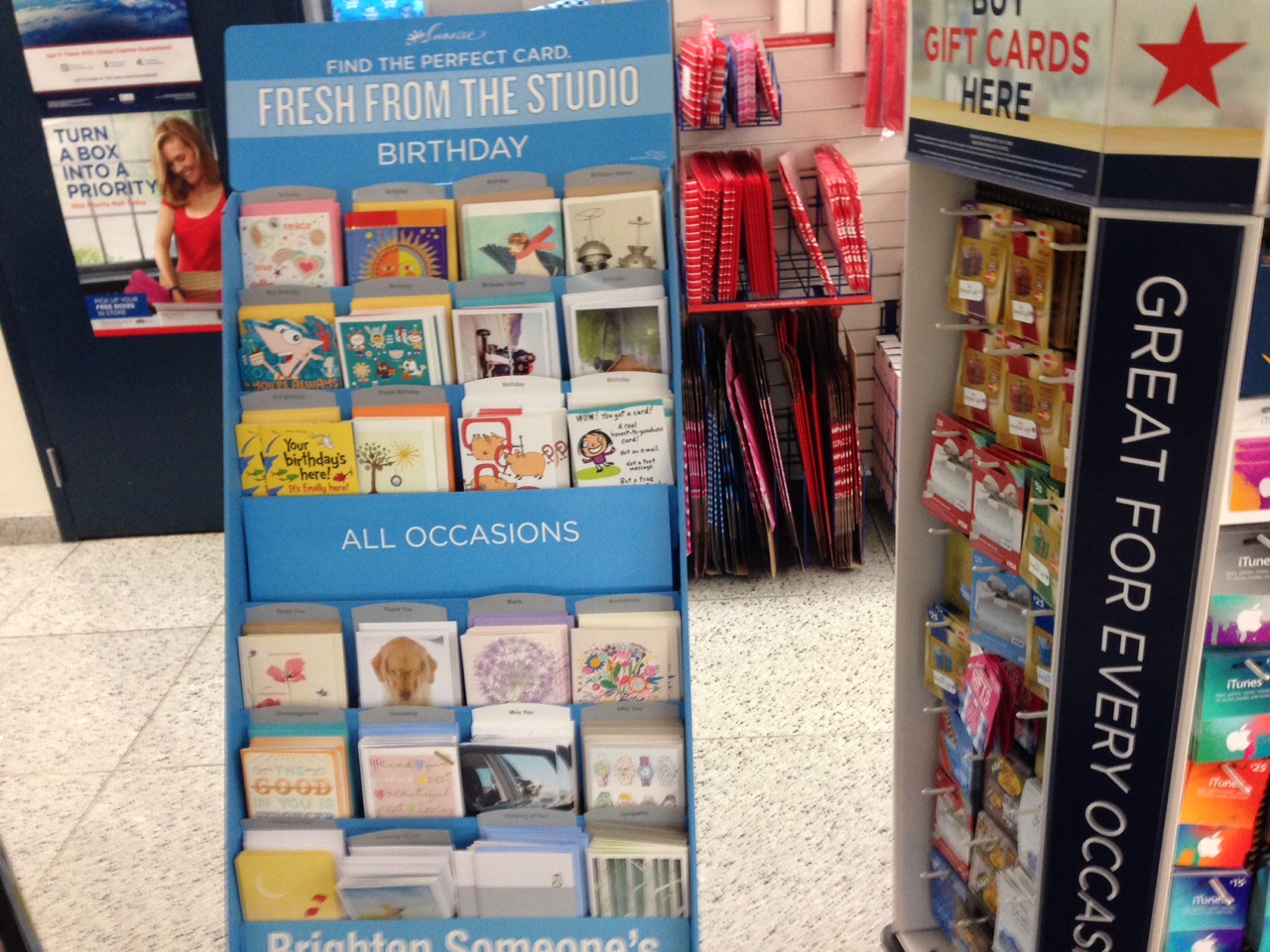 Next to the greeting cards is a rack of retail gift cards, perfect for the last minute desperate search for an overdue birthday gift.