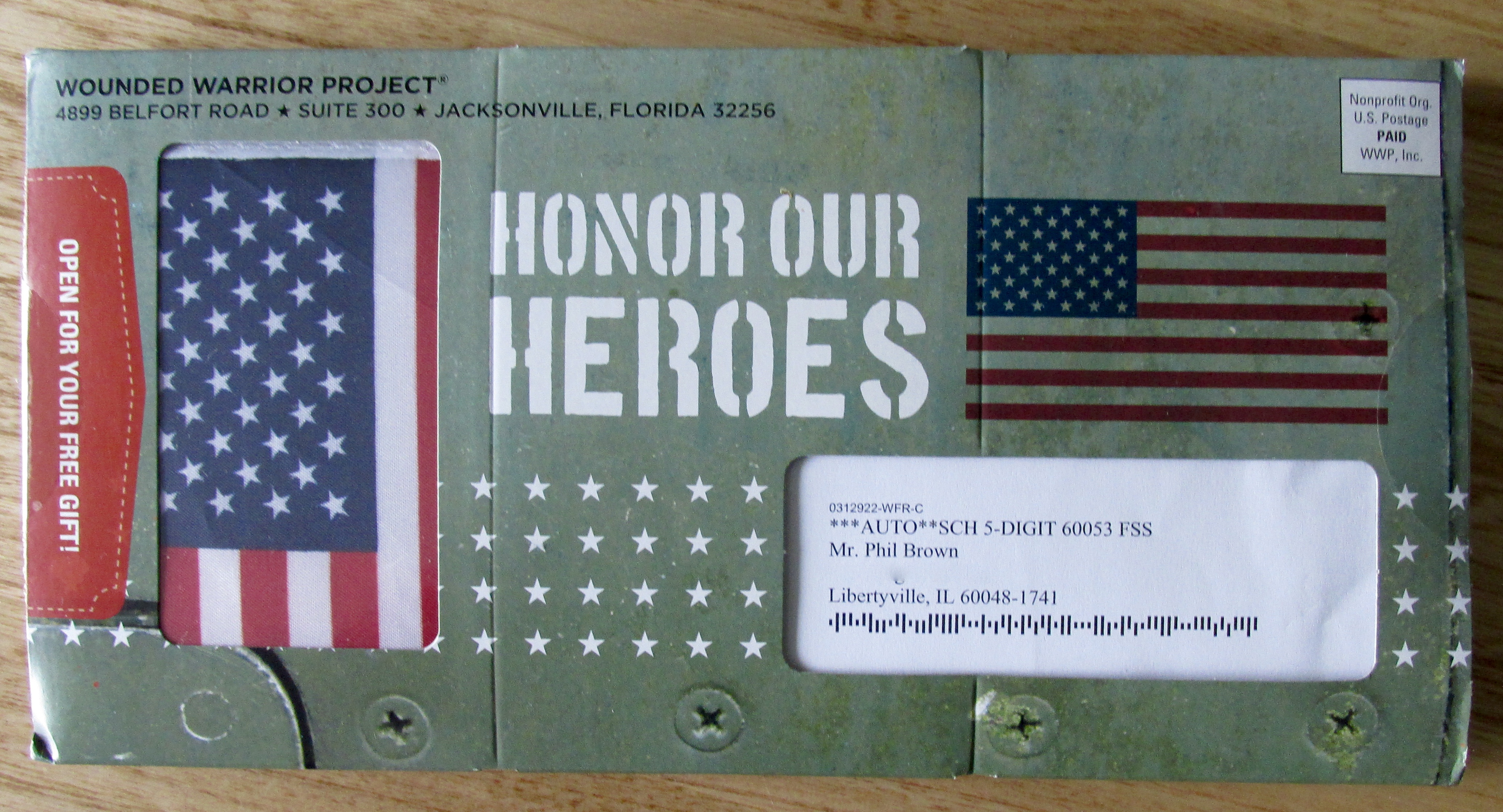 Wounded Warrior Project also sent along a separate request which included a 4×6, 20-page photo wallet. Inside a regular 6 x 9 envelope, this gift actually made immediate sense, and the wallet now holds images of our ridiculously brilliant, and beautiful grandchildren. Not being one to take anything for granted, we will reward WWP for the effort. Still, with postage, in-the-mail cost is 40-50 cents each.