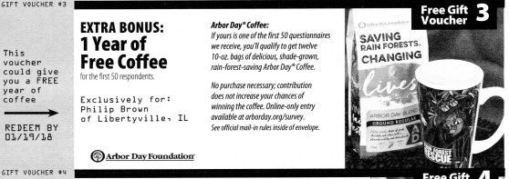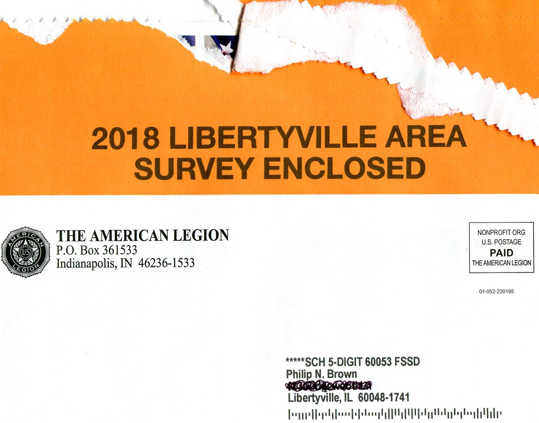The Veterans of Foreign Wars by comparison uses a tiny 3-3/4 x 7-1/2 envelope, aka a “Monarch” to ask the nagging question, “Did your special edition birthday cards arrive?” Somewhat reminiscent of the neighbor’s kid who knocks on our door to sell Christmas wrap. We still have six rolls from last year.