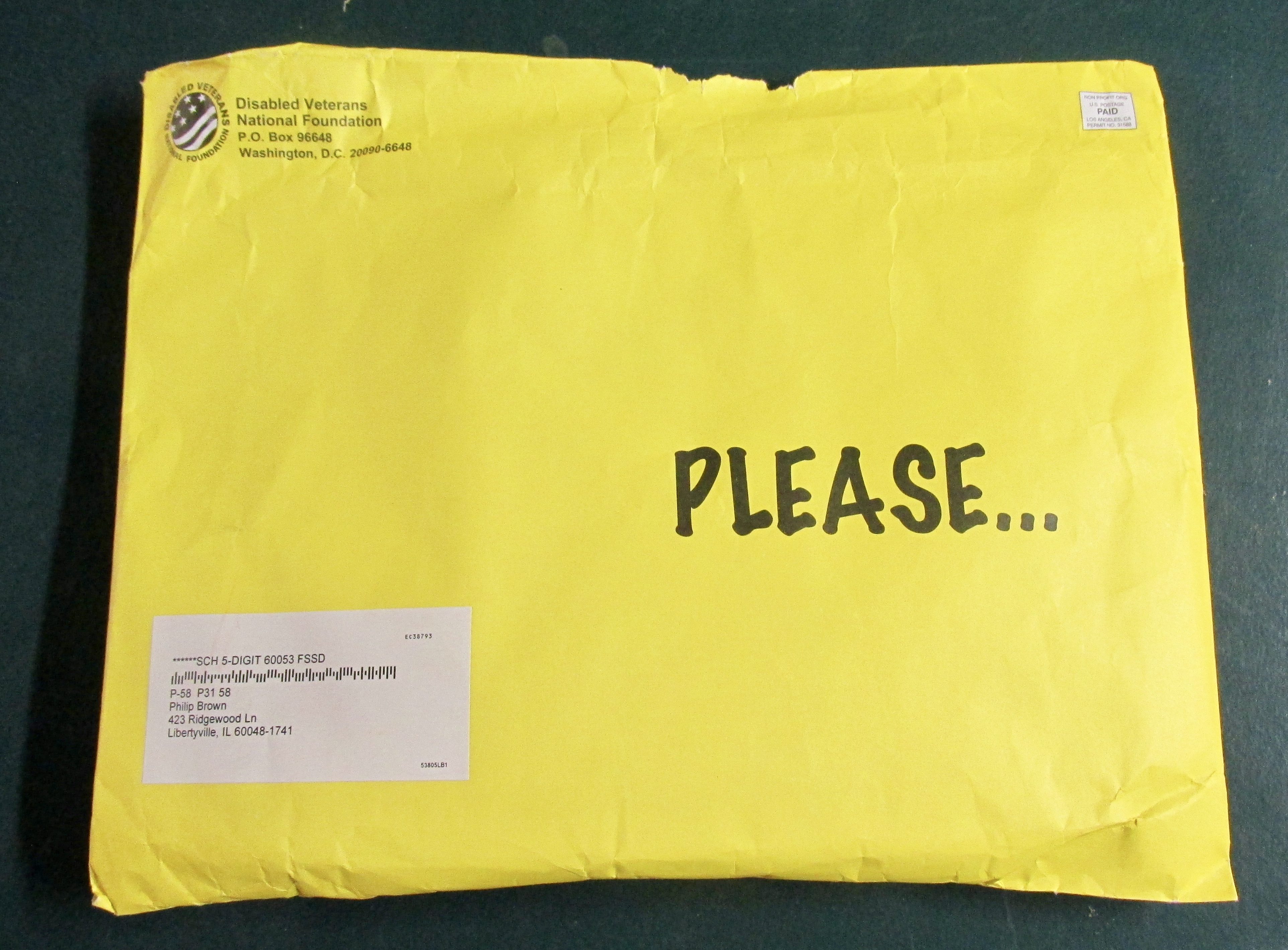 The Disabled Veterans National Foundation takes overwhelming force to a new level with their glossy, Flat-sized embossed package. Despite the red-stenciled “DO NOT FOLD” our faithful USPS carrier did just that to get it in the mailbox. It measures 12 x 15, and according to the weigh scales at our grocer’s fish counter, weighs 13.4 ounces. If that seems heavy to you, perhaps we have been paying too much for our halibut.