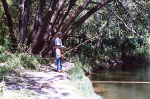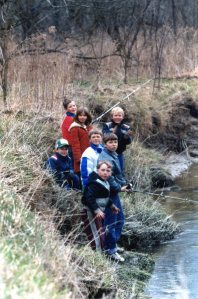 1996–Our boys ponder a launch of our Pal Chestnut off the front point of the cottage.
