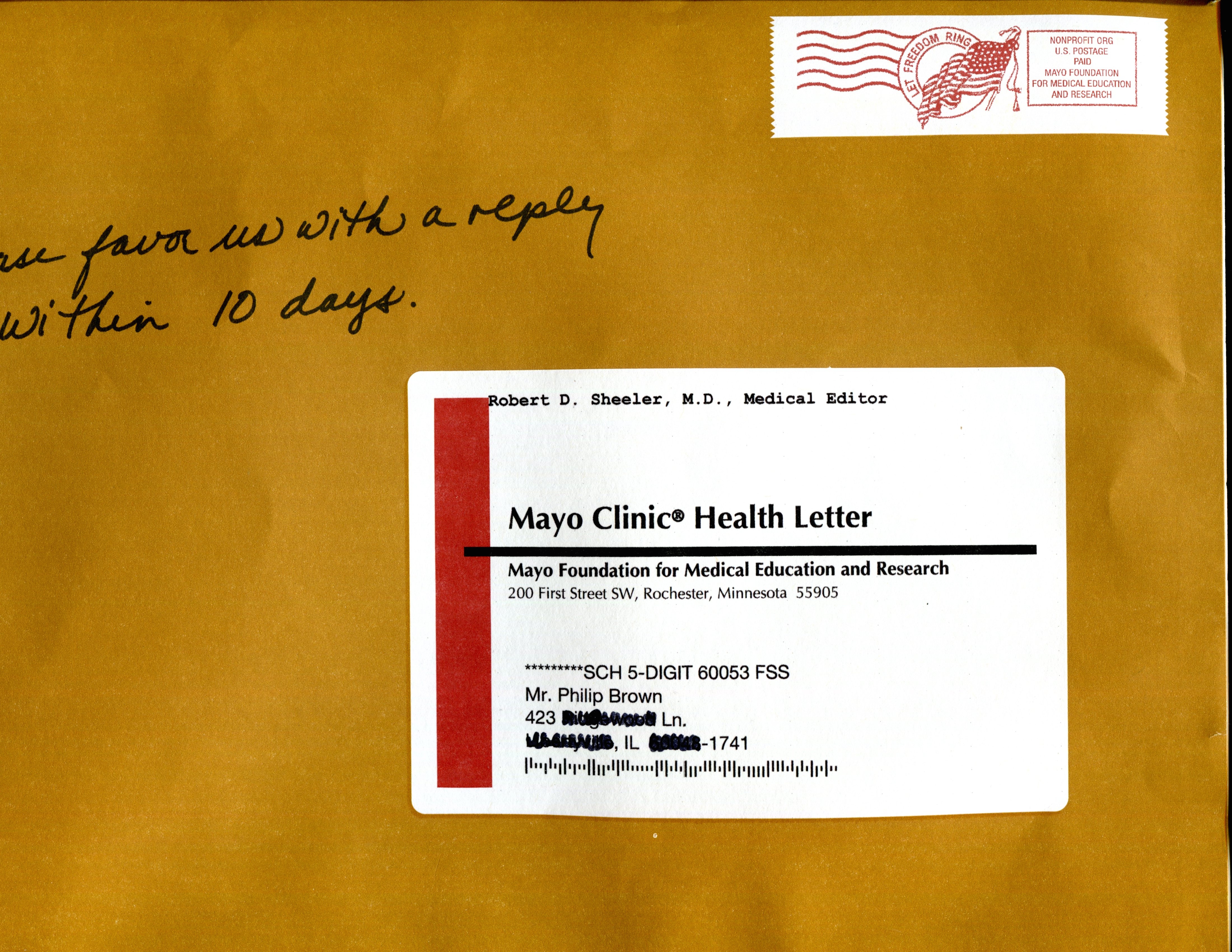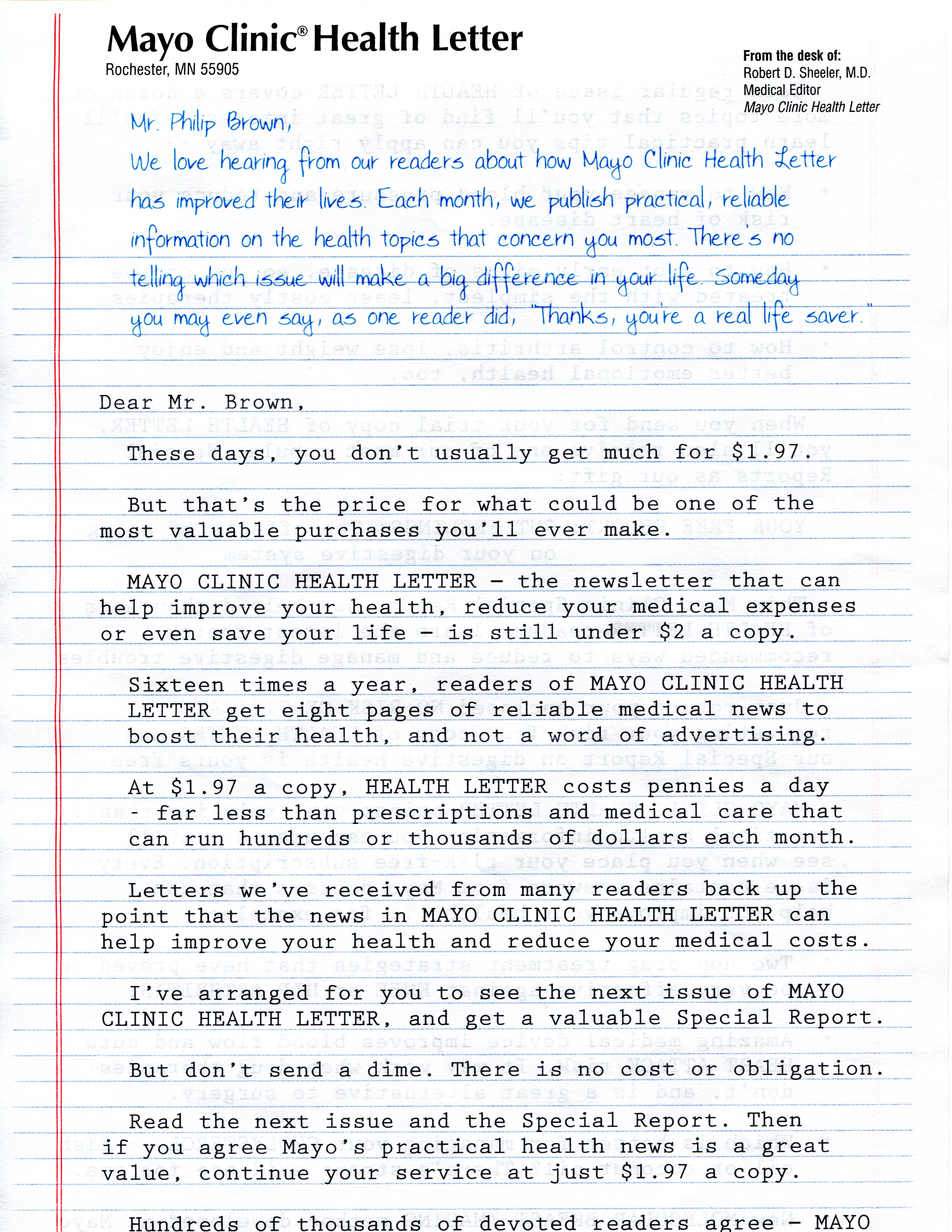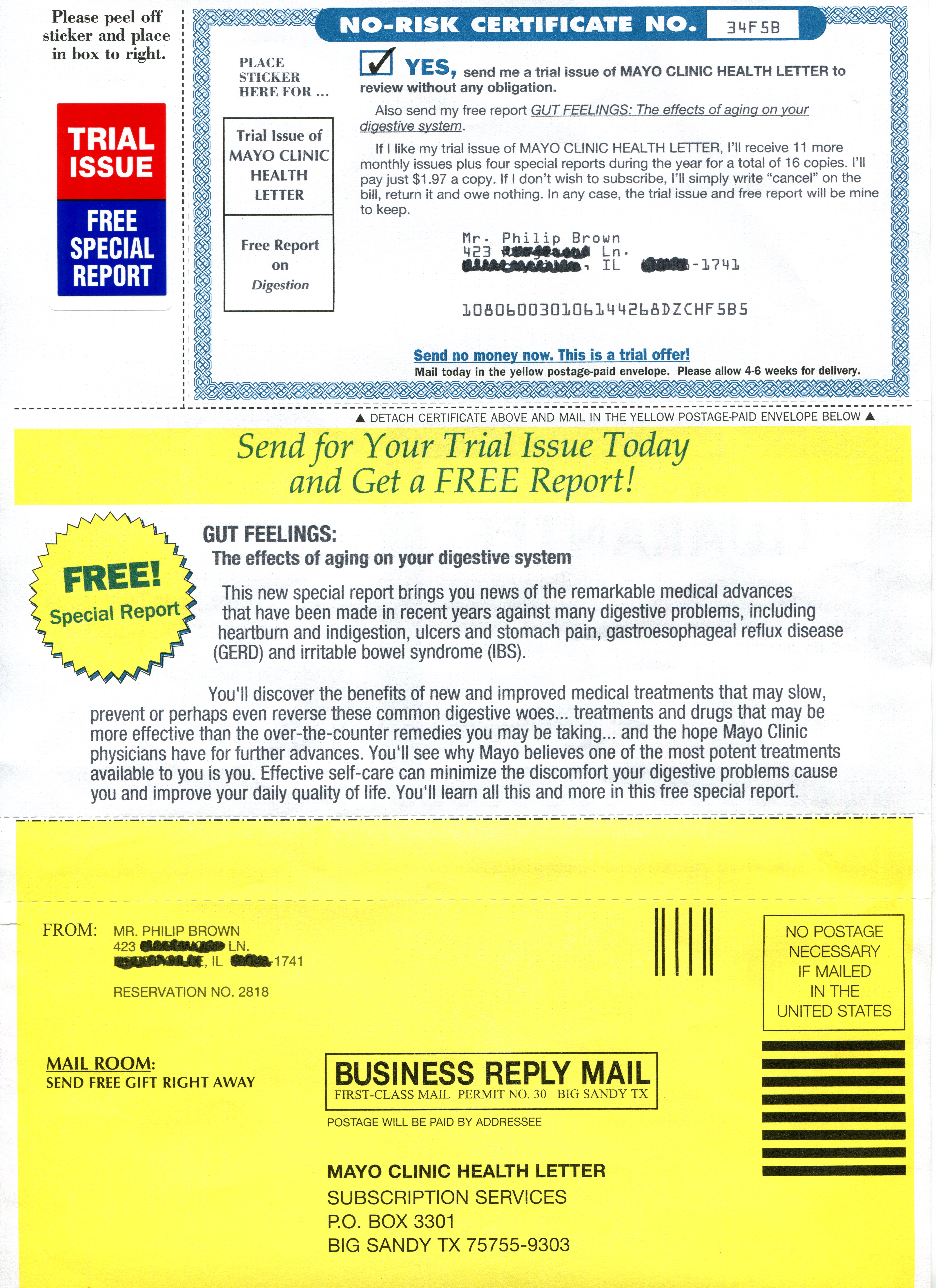 Smart, effective direct mail design comes from experience, and some times a lot of guts.    The Mayo Clinic Health Letter subscription kit is a classic example.   This masterpiece came to my mail box last month, and while the design may shake you, the numbers will knock you out.   Here’s why: