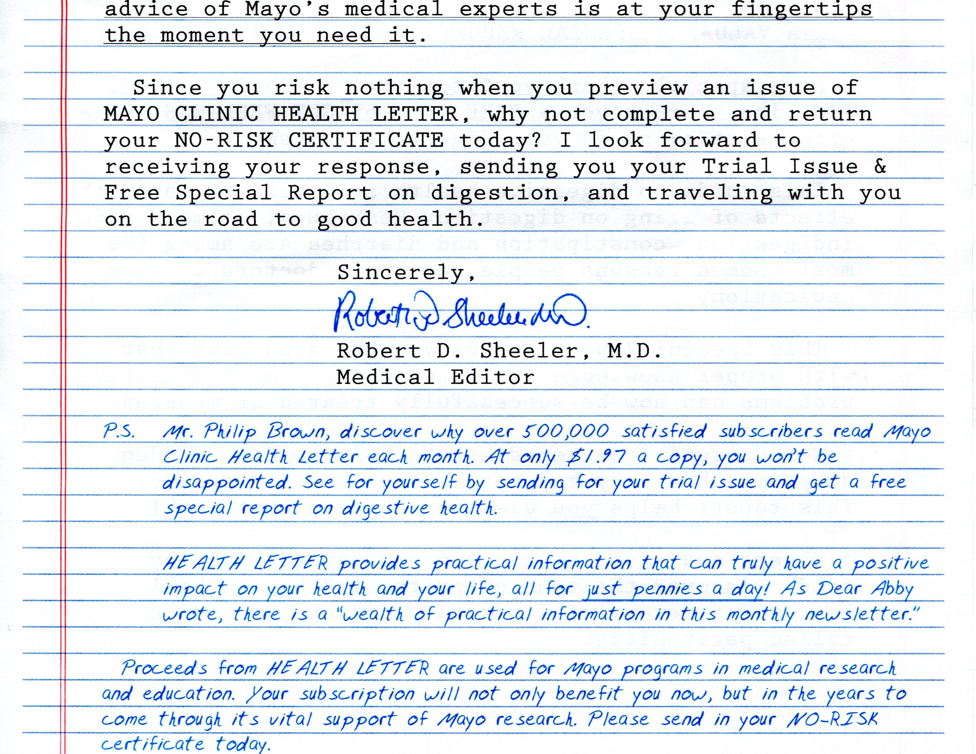 To dispel any last doubts about the Mayo brothers, they have also included a brochure on the Mayo Clinic just in case I had been hiding in a duck blind too long.   Plus a Post-It note stuck onto the letter quoting readers who bragged about how the newsletter fixed their swollen joints, their riled digestion and unbending digits.