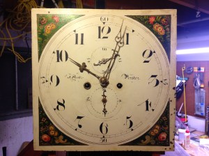 The clock was a mechanical puzzle for me.  It took literally 2 months of leveling, machine cleaning, tinkering, timing and fiddling with the works of the clock and its chime to get it to run.  During this time I scanned the internet to identify its maker, James Park, and thereby, date the clock.