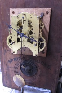 Having bared the brass works, I viewed a spotless brass and steel jumble of springs, cogs, spindles, bushings and wheels.  They were wound up tight.  I removed the bob, and laying the machine on its side, washed it down with some mineral spirits.  Suddenly, the pendulum started to quiver sporadically.   More scrubbing, and the pendulum rattled to life, flicking back and forth unimpeded by the brass bob.   After a few minutes, the clockworks were up and at it, relieving wound-up spring pressure frozen since the early 1940s.