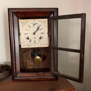 The Seth Thomas has now taken a new position on a side table in our family room.  It needs winding every three days, and faithfully attempts to strike its bedspring marking the hours and half hours.  I turned off the striker to avoid the continual reminders that time is passing.  But still, I enjoy twisting the brass key to re-wind the clock, and it gives me a moment to reflect on who has touched this antiquity.