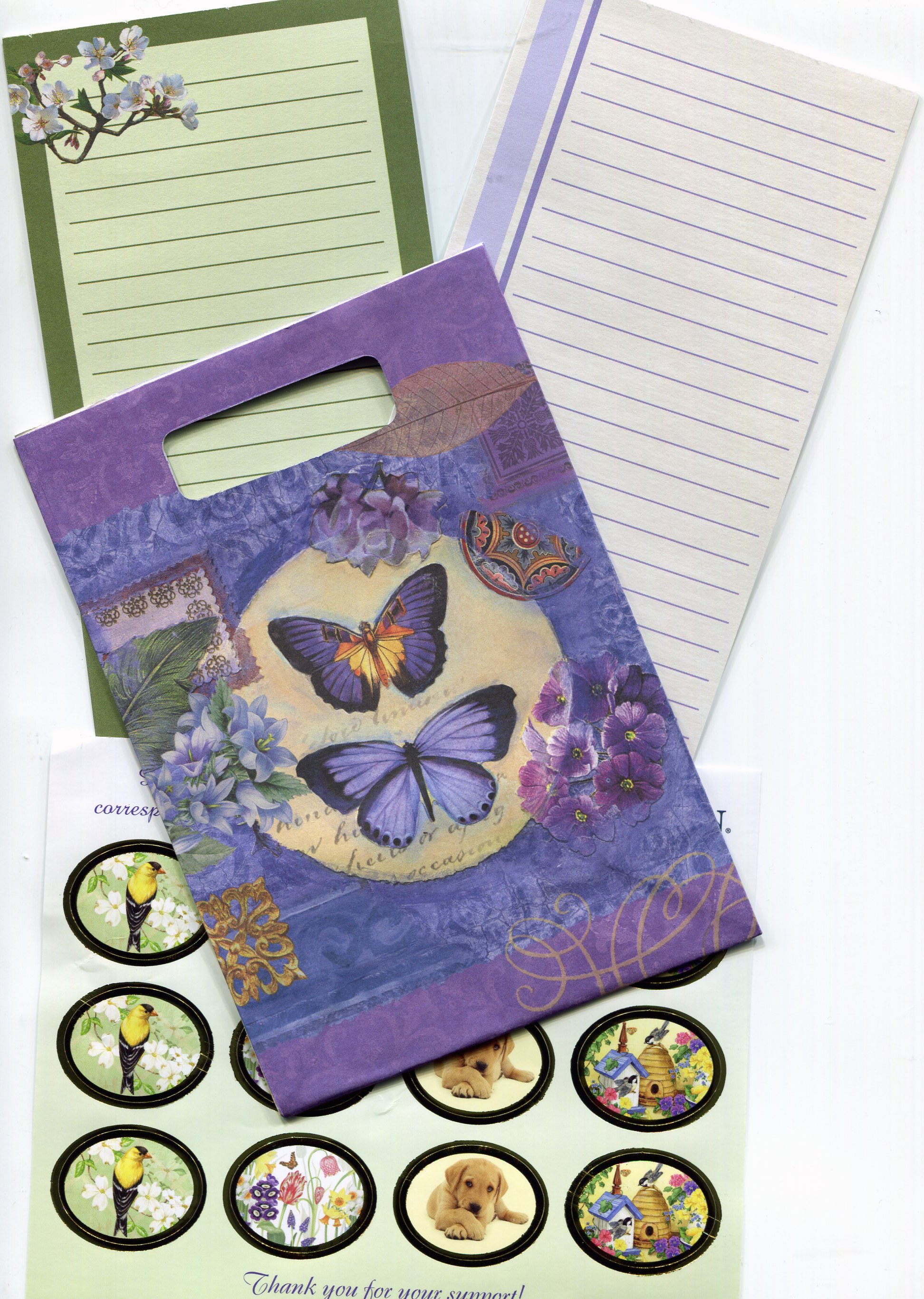 I can’t use any of this one, which is resplendent in lavender-hued Forget Me Nots. Still, if I was desperate, making a struggling attempt to write to my passed on mother, or to scratch out a hasty last will and testament, I have notepad, and mauve colored, simulated vellum sheets for assigning my debts to chosen in-laws.
