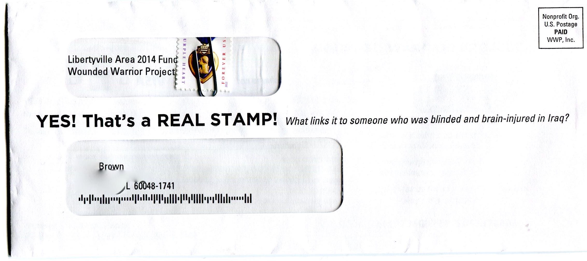 Help Our Wounded, and Armed Forces Aid Campaign have learned how to affix 3 plastic phone cards to a page. Technologically, this is pretty cool, if not done by hand. The cards are stuck on top of each other and appear jumbled through the large glassine window….as if they were thrown in quickly, sealed and run off to catch the 3 o’clock mail. The impact, especially for the uninitiated such as me, is strong. Their job is to get the envelope opened, and indeed, the ploy works. Help Our Wounded, aka Healing American Heroes is not found on Charity Navigator. My bet is the mailing costs 50-60 cents all-in.